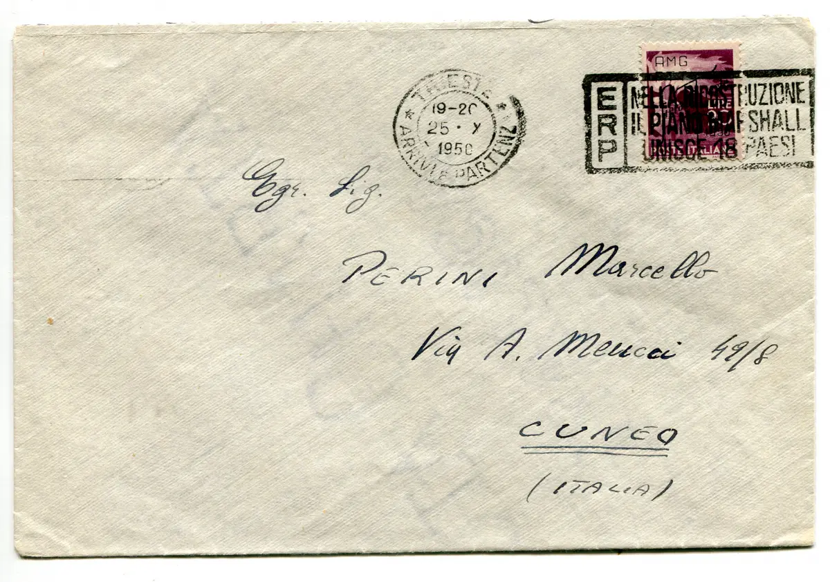 Triest A - Fiera di Trieste '50 isoliert auf Umschlag im Tarif Umschlag - Triest A - Fiera di Trieste 1950 Lire 20 Nr. 82 isoliert auf Umschlag für Cuneo - im Tarif Cod.1507/WEB