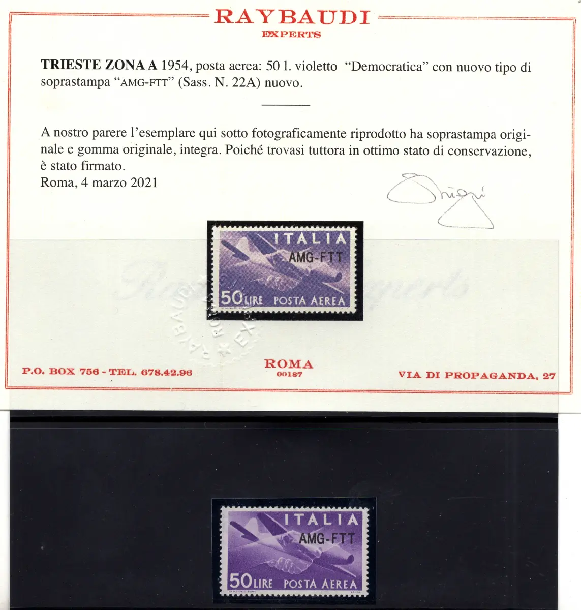 MNH ** - Luftpost Lire 50 Nr. 22A modifizierter Aufdruck, sehr gut frisch gut zentriert - Cert. Raybaudi - Katalog Euro 550 + Cod. 960/16