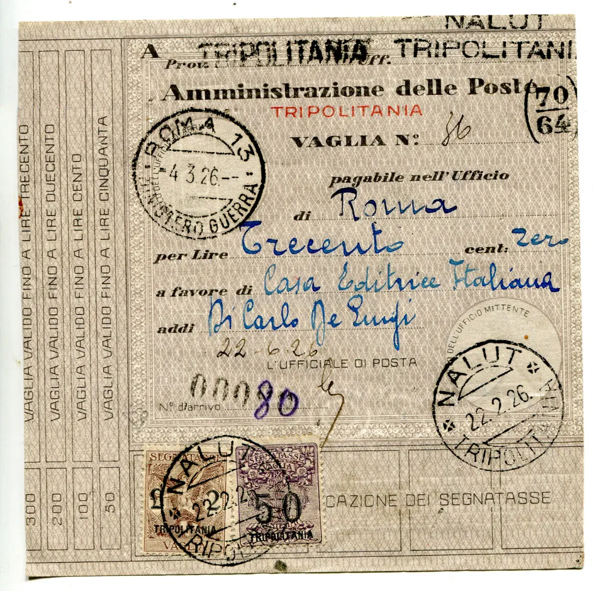 - Tripolitanien - Steuermarken Vaglia Lire 2 Nr. 5 + ergänzende Cent. 50 Nr. 2 auf Nalut Annullierungszettel vom 22.2.26 - sehr guter Erhaltungszustand und wertvoller Standort - ED - Kat. euro 900 n. 1039/L