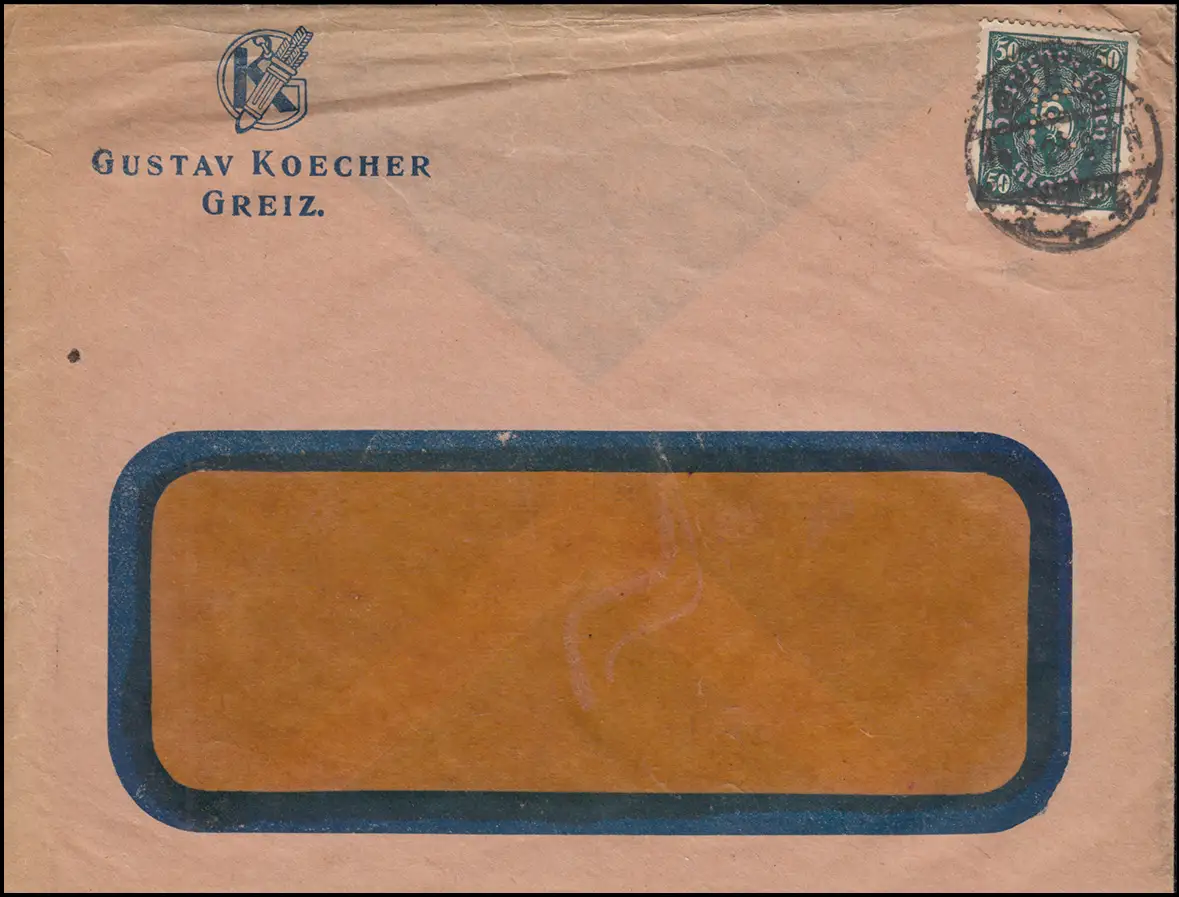 Trou K sur Infla 50 Mark comme EF sur la lettre de fenêtre GREIZ 19.1.23