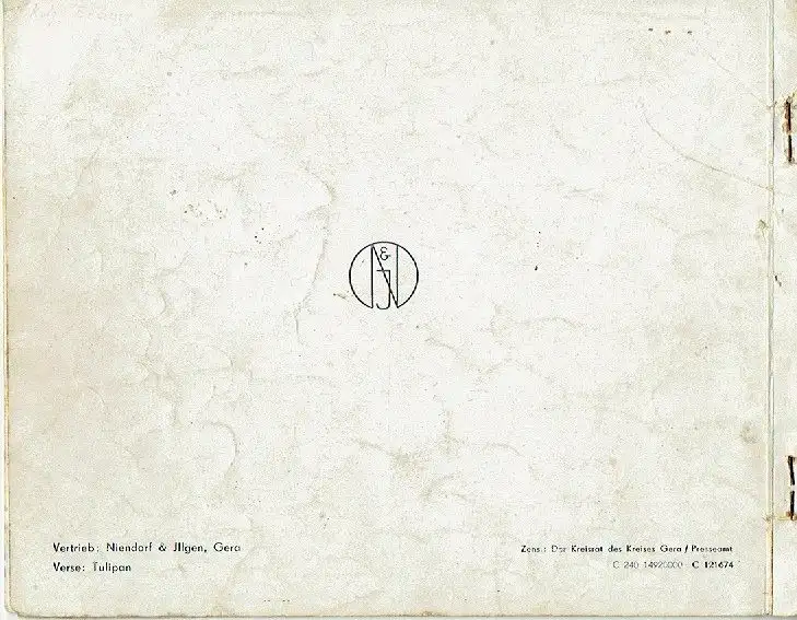 mittlerer bis guter Zustand, Gebrauchs- und Alterungsspuren: Deckel am linken Rand teils defekt und ziemlich fleckig - Rückseite teils etwas beschabt und gering verschmutzt - leichter Klammerrost - Seiten sauber und ordentlich - eine Seite unten ca. 1 cm eingerissen - Umschlag und Seiten teils etwas eselsohrig - Seiten teils leicht knittrig - Rückseite im Falzrand teils gering defekt, sehr seltenes Bilderbuch aus der Nachkriegsproduktion, Zensur freigegeben vom Kreisrat des Kreises Gera / Presseamt (gab es nicht mehr in der DDR als Aufdruck, ist aber auch keine sowjetische Militärzensur, erschienen also in der Zeit kurz vor Gründung der DDR, also etwa 1948 bis Anfang 1949) Tulipan = Hermann Luboldt (*1892 in Cuba (OT von Untermhaus, heute beide zu Gera), † 1962, gilt heute als einer der bedeutendsten Heimatschriftsteller der Stadt Gera "Rudolf G. Werner (* 22. Mai 1893 in Gera; † 14. Dezember 1957 ebenda) war ein deutscher Maler." (Wikipedia), ungebunden (alle Blatt original links von oben geklammert), ca. 18,5 x 14,5, 8 Blatt mit 10 ganzseitigen Bildern