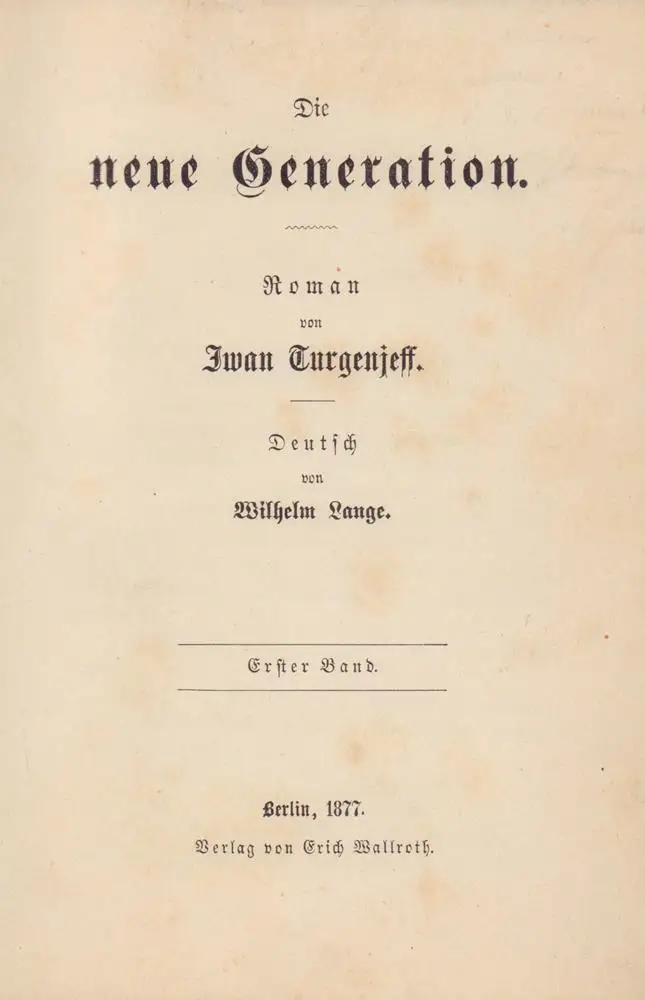 [Nov'; dt.]. - Erste (?) deutsche Ausgabe, im Jahr der russischen Erstausgabe (vgl. Wilpert, Lex. d. Weltlit., S. 1642); im selben Jahr erschien Wilhelm Langes Übersetzung bei Reclam in Leipzig (dort mit kleinen Abweichungen) sowie unter dem später gängigeren Titel "Neuland" bei Janke in Berlin u. als Bd. 10 der "Ausgewählten Werke" bei Behre in Hamburg. - Ivan Sergeevic Turgenev [Iwan S. Turgenjew (1818-1883)] kann (etwas plakativ) der russische Dickens genannt werden. - Wilhelm Lange (1849-1907), Übersetzer aus dem Russischen, Englischen, Norwegischen (DNB). - Ecken l. bestoßen, Name auf hint. Innendeckel; gutes Exemplar