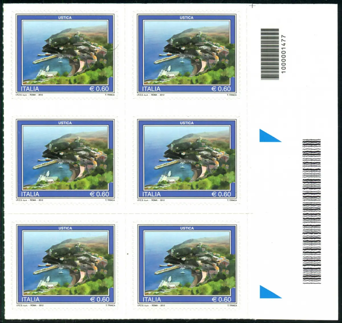 Turistica Ustica 2012 Sorte Vollgummi - Turistica '2012 Euro 0,60 Ustica Nr. 3334 Block von sechs a. di f. mit Barcode ohne Spur oder oberen Briefmarken (Sass. Spec. Nr. 2985 Ea) - Ungewöhnliche Nr. 685/L