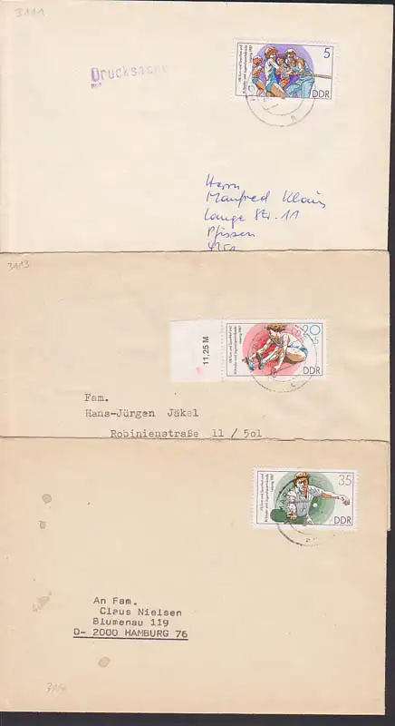 Turn- und Sportfest Leipzig 1987, drei portogenaue Briefe (3111, 3113, 3114)