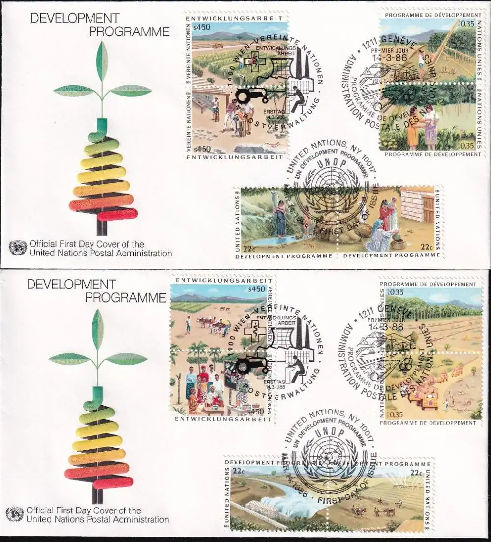 UNO NEW YORK - WIEN - GENF 1986 TRIO-FDC Entwicklungsarbeit