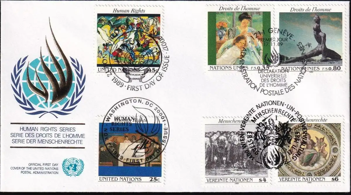 UNO NEW YORK - WIEN - GENF 1989 TRIO-FDC Menschenrechte