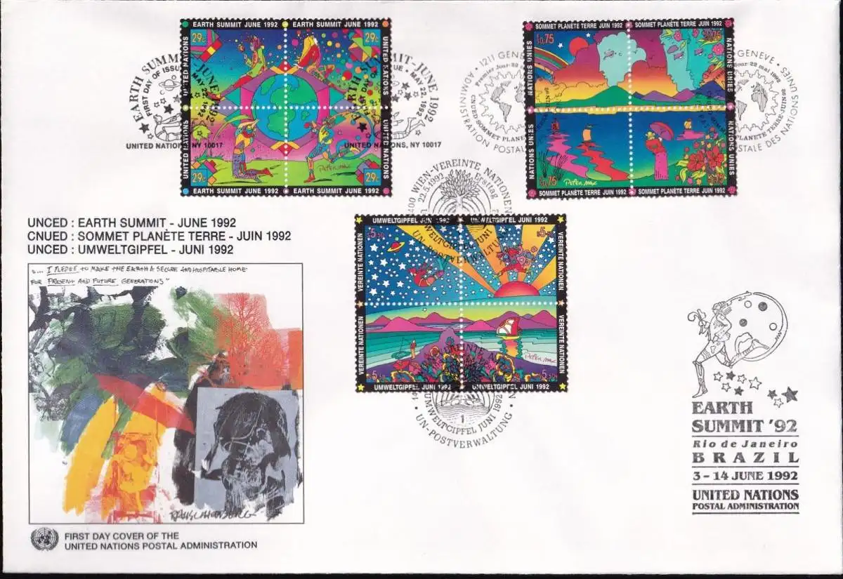 UNO NEW YORK - WIEN - GENF 1992 TRIO-FDC Umweltgipfel + Stempel Earth Summit
