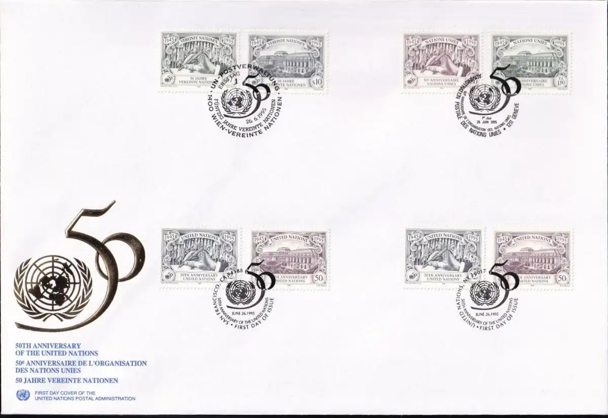 UNO NEW YORK - WIEN - GENF 1995 TRIO-FDC 50 Jahre Vereinte Nationen