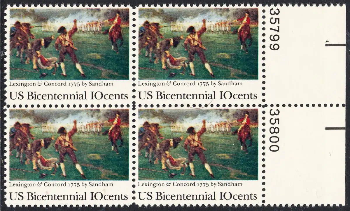 USA Michel 1171 / Scott 1563 postfrisch BLOCK RÄNDER rechsts m/ Platten-# (a2) - 200 Jahre Unabhängigkeit der Vereinigten Staaten von Amerika (1976): 200. Jahrestag der Schlacht von Lexington-Concord