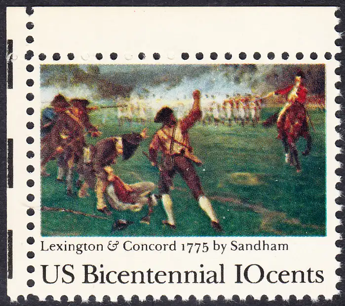 USA Michel 1171 / Scott 1563 postfrisch EINZELMARKE ECKRAND oben links - 200 Jahre Unabhängigkeit der Vereinigten Staaten von Amerika (1976): 200. Jahrestag der Schlacht von Lexington-Concord