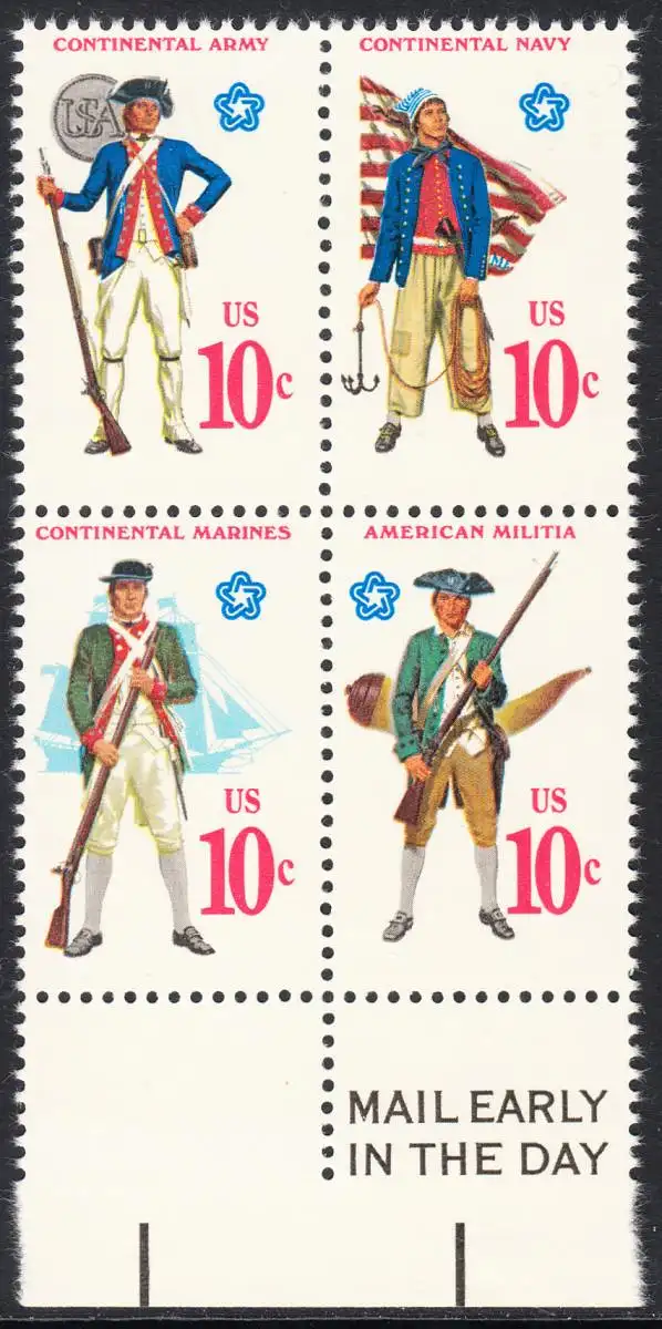 USA Michel 1175-1178 / Scott 1565-1568 postfrisch BLOCK RÄNDER unten m/ MailEarly - 200 Jahre Unabhängigkeit der Vereinigten Staaten von Amerika (1976): Militäruniformen (Marineinfanterie / Bürgerwehr / Heer / Seestreitkräfte)
