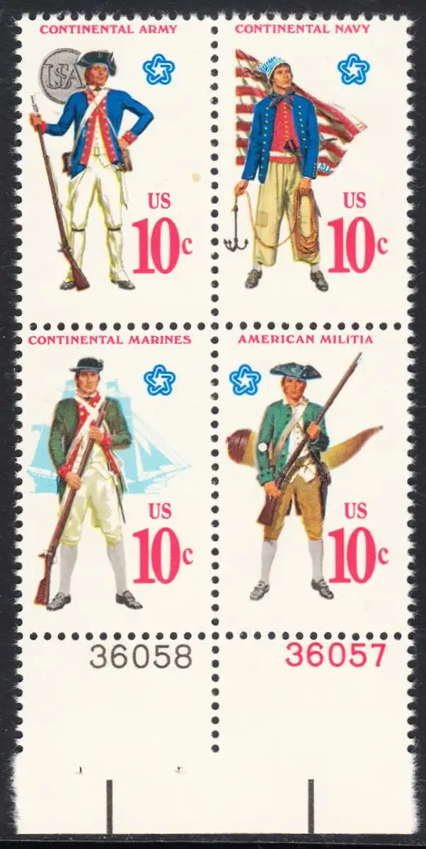 USA Michel 1175-1178 / Scott 1565-1568 postfrisch BLOCK RÄNDER unten m/ Platten-# (a1) - 200 Jahre Unabhängigkeit der Vereinigten Staaten von Amerika (1976): Militäruniformen (Marineinfanterie / Bürgerwehr / Heer / Seestreitkräfte)