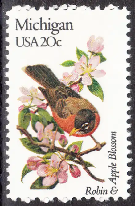 USA Michel 1553 / Scott 1974 postfrisch EINZELMARKE (a1) - Vögel und Blumen der 50 Bundesstaaten: Michigan: Wanderdrossel/Apfelblüte