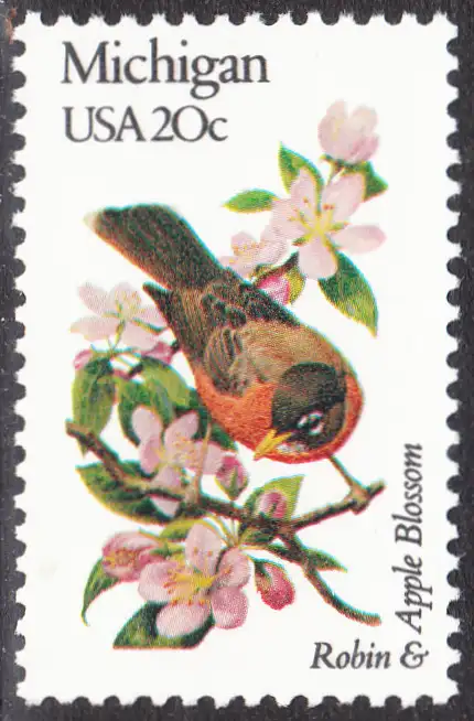 USA Michel 1553 / Scott 1974 postfrisch EINZELMARKE (a2) - Vögel und Blumen der 50 Bundesstaaten: Michigan: Wanderdrossel/Apfelblüte