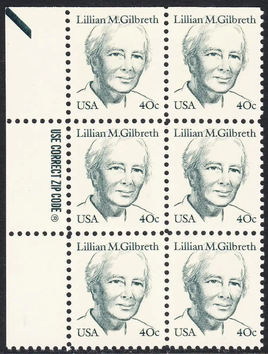 USA Michel 1682 / Scott 1868 postfrisch vert.BLOCK(6) RÄNDER links m/ ZIP-Emblem (oben ungez. / a2) - Amerikanische Persönlichkeiten: Lilian M. Gilbreth (1878-1972), Ingenieurin