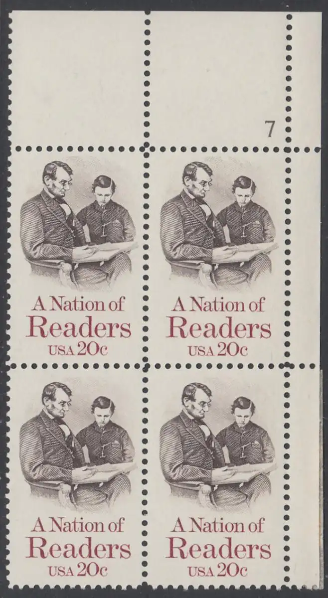 USA Michel 1715 / Scott 2106 postfrisch (Gumm.beeintr.) PLATEBLOCK ECRAND oben rechts m/ Platten-# 7 - Lesen: Abraham Lincoln liest seinem Sohn vor