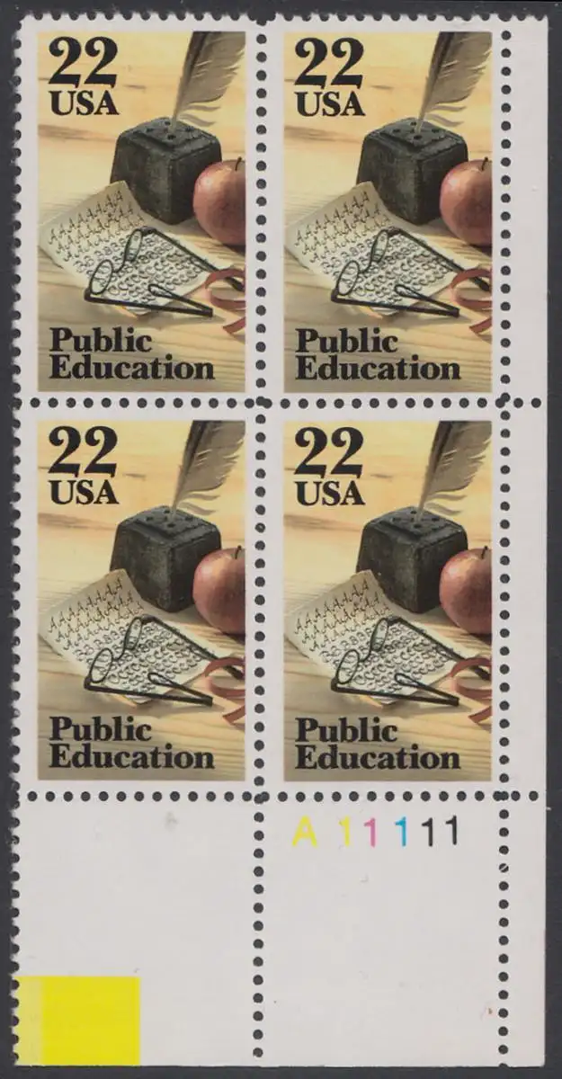 USA Michel 1771 / Scott 2159 postfrisch (Gumm. beeintr.) PLATEBLOCK ECKRAND unten rechts m/ Platten-# A11111 (b) - Öffentliches Schulwesen: Schreibfeder, Übungsblatt, Brille
