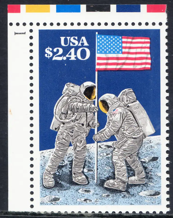 USA Michel 2046 / Scott 2419 postfrisch EINZELMARKE ECKRAND oben links m/ Platten-# 1 - Schnellpostmarke: 20. Jahrestag der ersten bemannten Mondlandung; Astronauten Neil Armstrong (1930-2012) und Edwin Aldrin (*1930) mit amerikanischer Flagge
