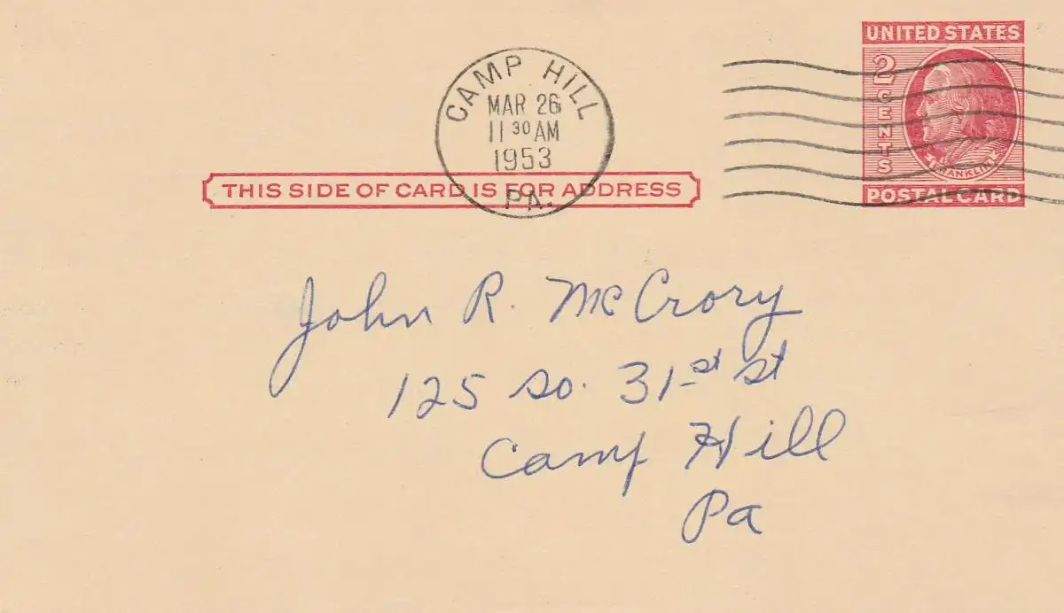 USA: Reklamekarte (Postal card with advertising), Camp Hill, PA, 1953