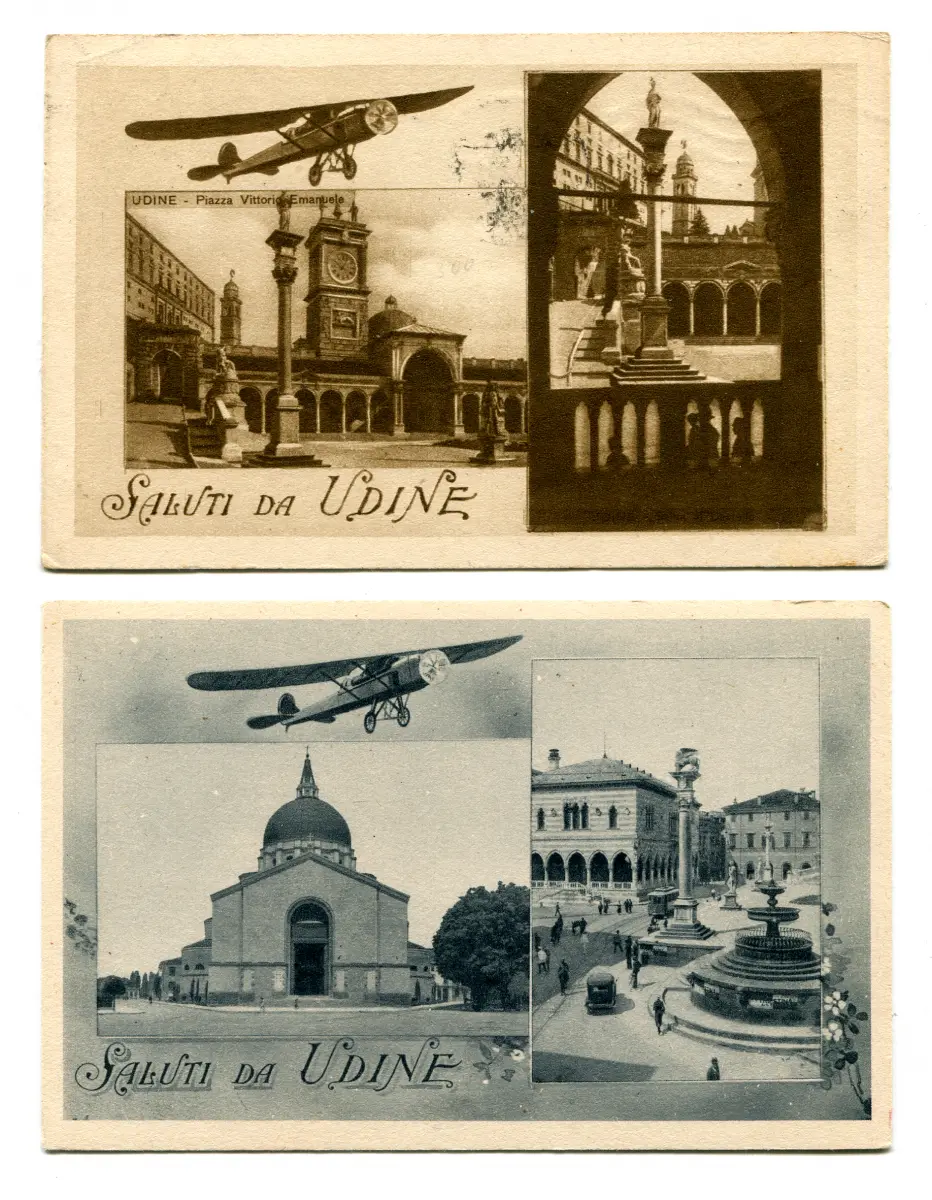 Udine ..Gruss aus - Zwei verschiedene Doppelansichtskarten mit Flugzeug AK - Udine ..Gruss aus - Zwei verschiedene Doppelansichtskarten mit Flugzeug im Flug (Fantasy-Fotomontage) - eine neue, gereiste sehr guter Erhaltungszustand Cod. 117/16
