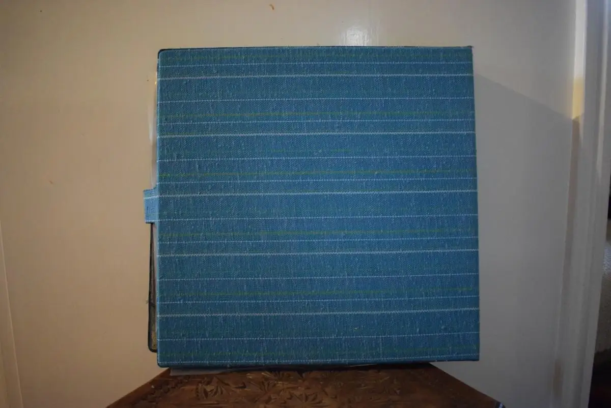 Dieser Schuber hier ist außen Stoff überzogen , sauber und heil , ein solides Stück Aufbewahrungs Zubehör der 60er oder 70er Jahre , Fassungsvermögen in diesem Falle 10 LPs oder Maxis .