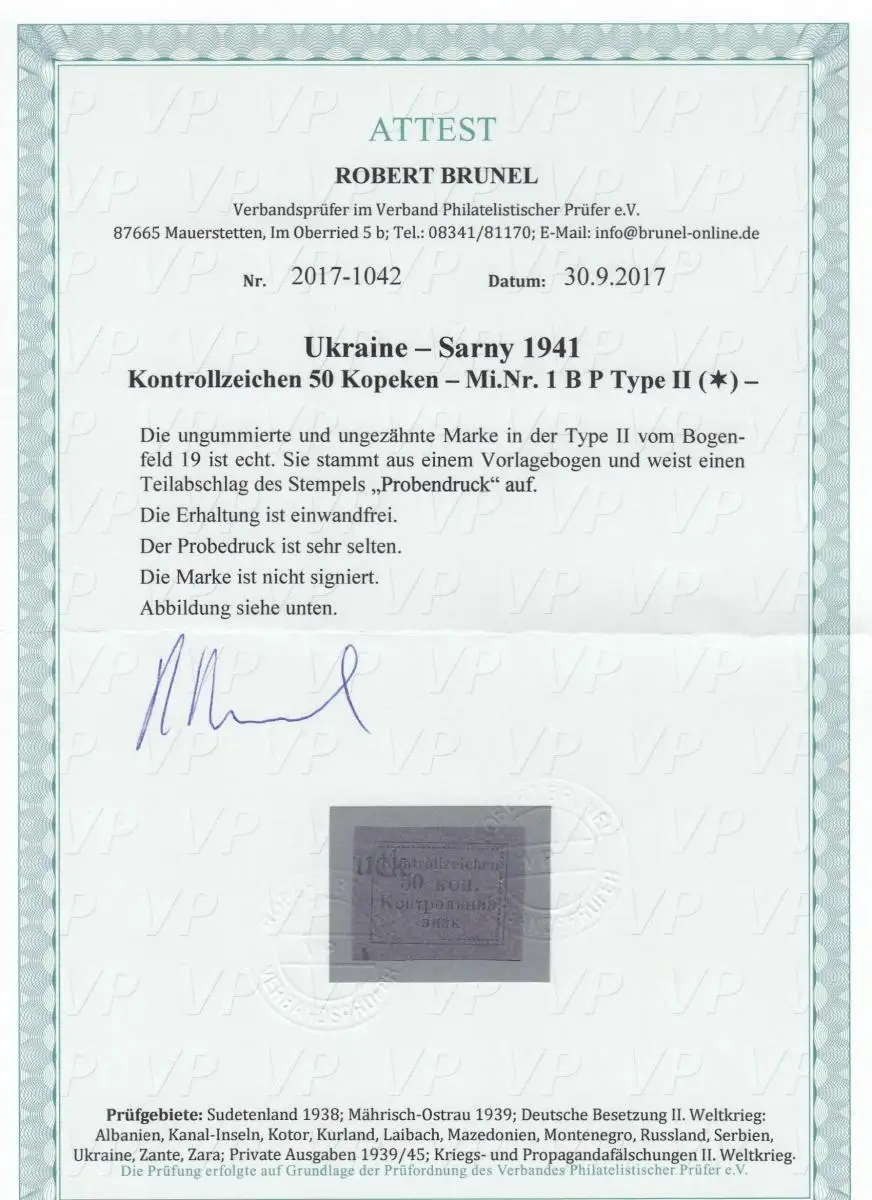 Ukraine - Sarny 1941: MiNr. 1 B P Type II, pression d'essai, non élastique