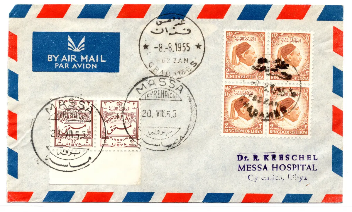 Umschlag - - - Unabhängiges Libyen - König Idris 2 m. Ocker Nr. 34 Viertel auf Umschlag von Ghadames Fezzan am 8.8.55 für Steuermasse, die am 20.8.55 eintrifft, mit Steuermarkenpaar 2 m. Braun Nr. 1 - Rückseite Ann. aus Bengasi, Massa und Tripolis - Selten, obwohl als philatelistische Verwendung zu betrachten Cod. 2549/WEB