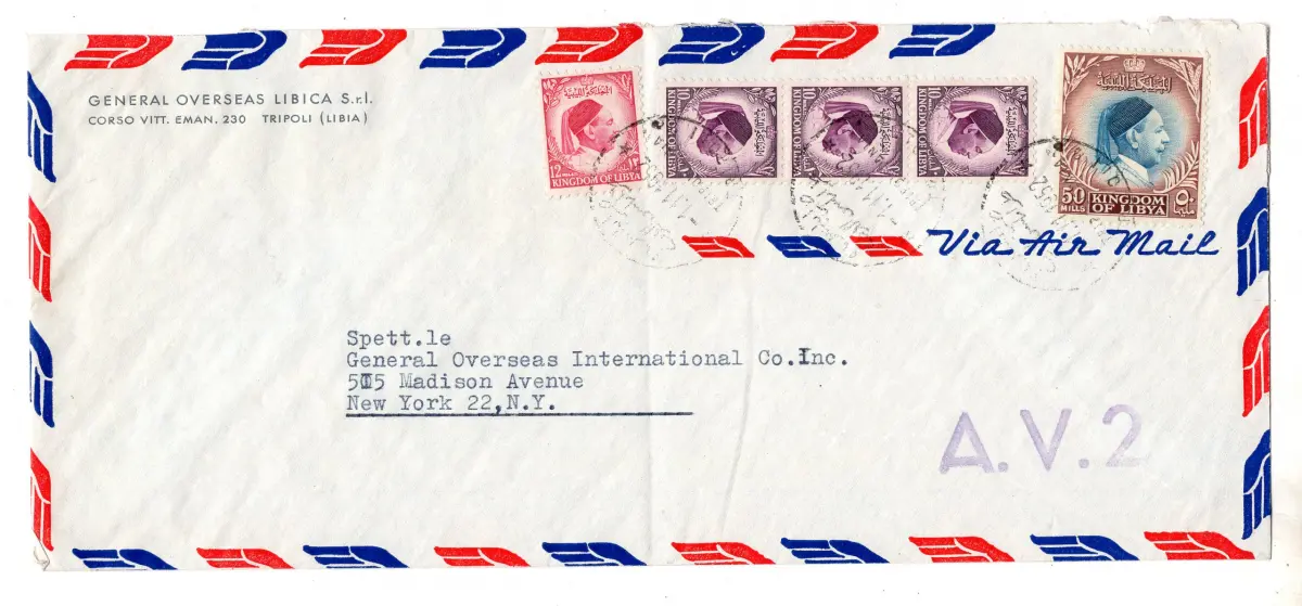 Umschlag - - Unabhängiges Libyen - König Idris 50 m. Braun-Hellblau Nr. 42 + Ergänzungen Nr. 38 x 3 + 39 auf Luftumschlag nach New York am 1.11.52 - Abfahrt zweisprachige Annullierung von Tripolis - seitlich mit lila Stempel A. V. 2 - hochwertiger Gebrauch, nicht philatelistisch 12m. Cod. 2540/WEB