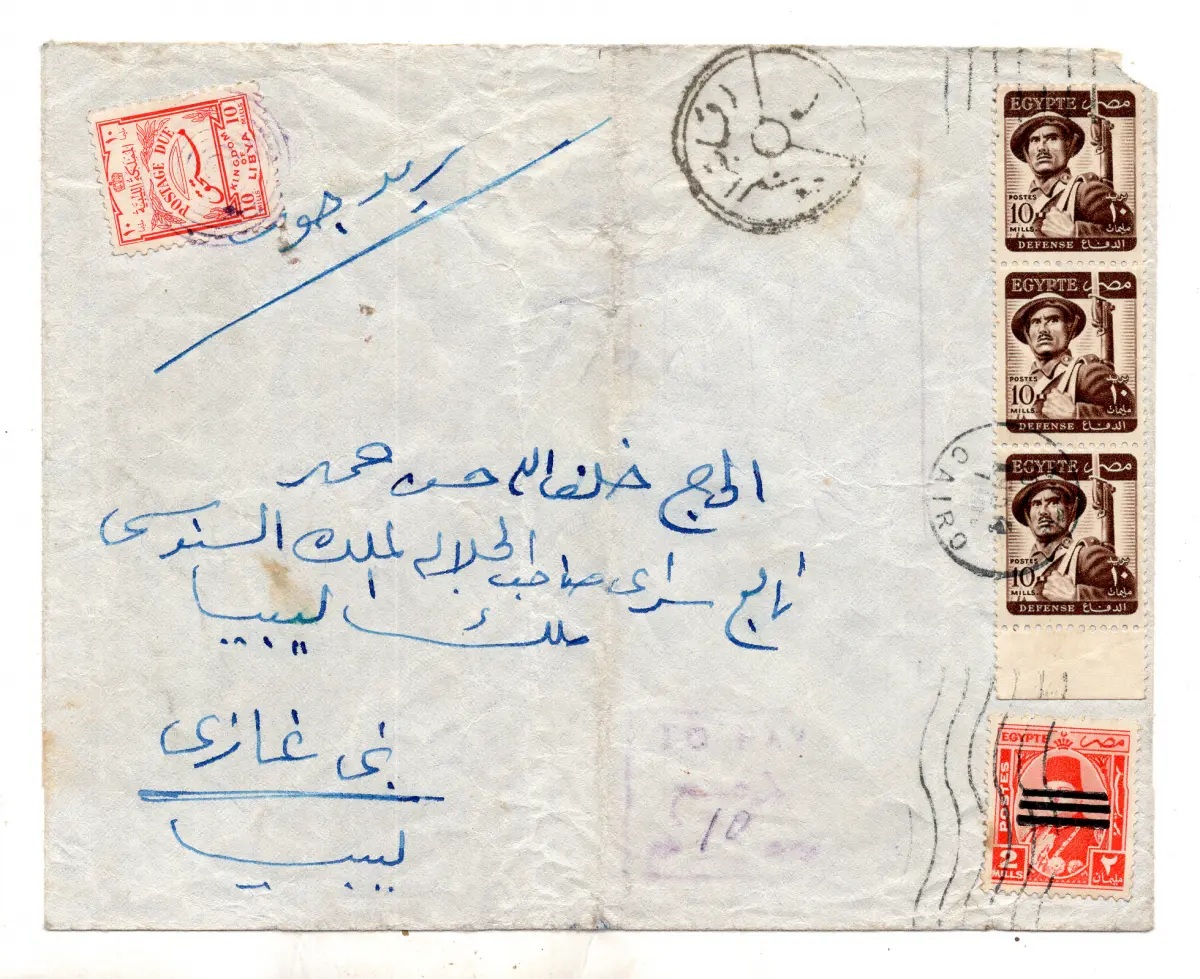 Umschlag - - Unabhängiges Libyen - Umschlag aus Ägypten besteuert bei der Ankunft in Bengashi am 19.4.54 mit 10 m Steuermarke. Rosa (Steuer Nr. 3) - Adresse in arabischer Sprache - Sehr selten, nicht philatelistisch - Umschlag von mittlerer Qualität - Mittelfalz, der die Frankatur nicht betrifft Cod. 2545/WEB