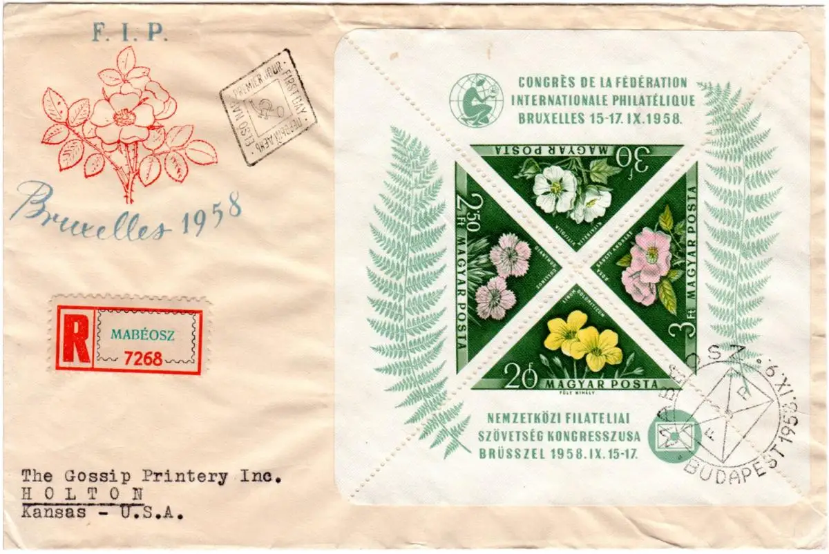 Ungarn 1958, Block 28 A Blumen auf Einschreiben Brief v. Mabeosz n. USA