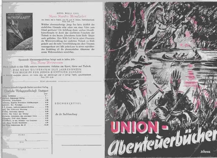 Union Deutsche Verlagsgesellschaft Stuttgart: Union - Abenteuerbücher. Verlagsprospekt. - Im Inhalt 13 bebilderte Buchvorstellungen, u. a. Defoe - Robinson Crusoe, Marryat: Sigismund Rüstig, Stevenson, Schatzinsel, Wellman: Das Geheimnis des einsamen Tale