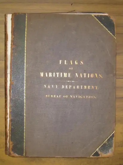 Size 8 ° (26: 22 cm). Original brown leather strap with leather corners and gold stamped cover title. Front lid loose. Corners, capitals, edges and joints strongly rubbed, partly pierced. Front flyleaf with long handwritten dedication. (8) Pages titles and registers of the flags, 19 colored plates with many flag and pennant reproductions, numbered I - XVIII plus a plate IIa. Completely. Exactly checked side by side. Indoors with some minor stains nd finger marks. Quite well received. With beautiful reproductions of flags and pennants. -- Gr.-8° ( 26 : 22 cm). Brauner Originalhalblederband mit Lederecken und goldgeprägtem Deckeltitel. Vorderer Deckel lose. Ecken, Kapitale, Kanten und Gelenke stark berieben, teils durchstoßen. Vorderes Vorsatzblatt mit langer handschriftlicher Zueignung. (8) Seiten Titel und Register der Flaggen, 19 farbige Tafeln mit vielen Flaggen- und Wimpelwiedergaben, numeriert I - XVIII zuzüglich einer Tafel IIa. Komplett. Seite für Seite genau überprüft. Im Innenbereich mit einigen kleineren Anschmutzungen nd Fingerflecken. Durchaus gut erhalten. Mit schönen Wiedergaben der Flaggen und Wimpel