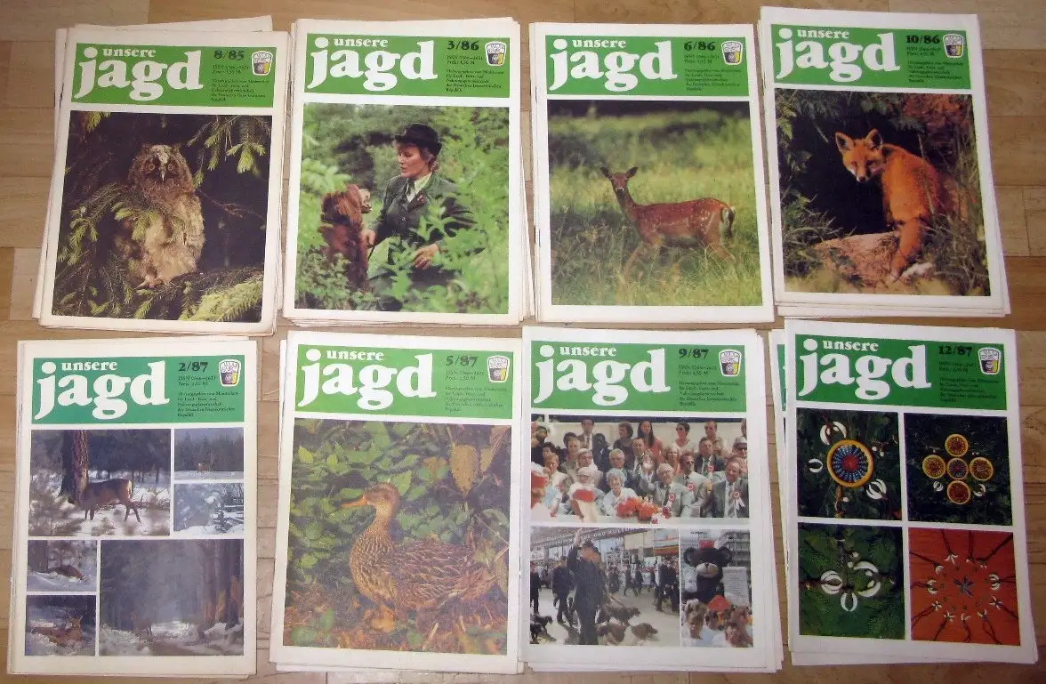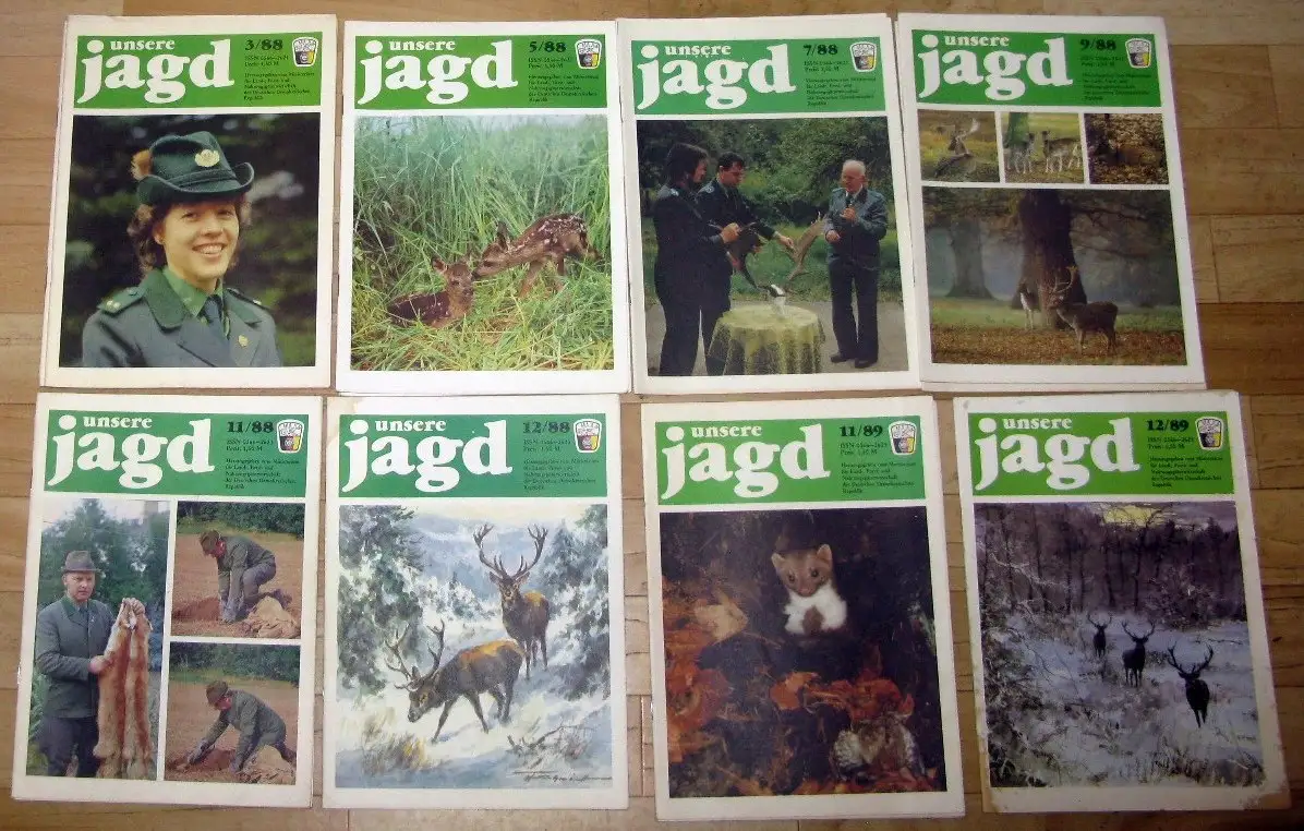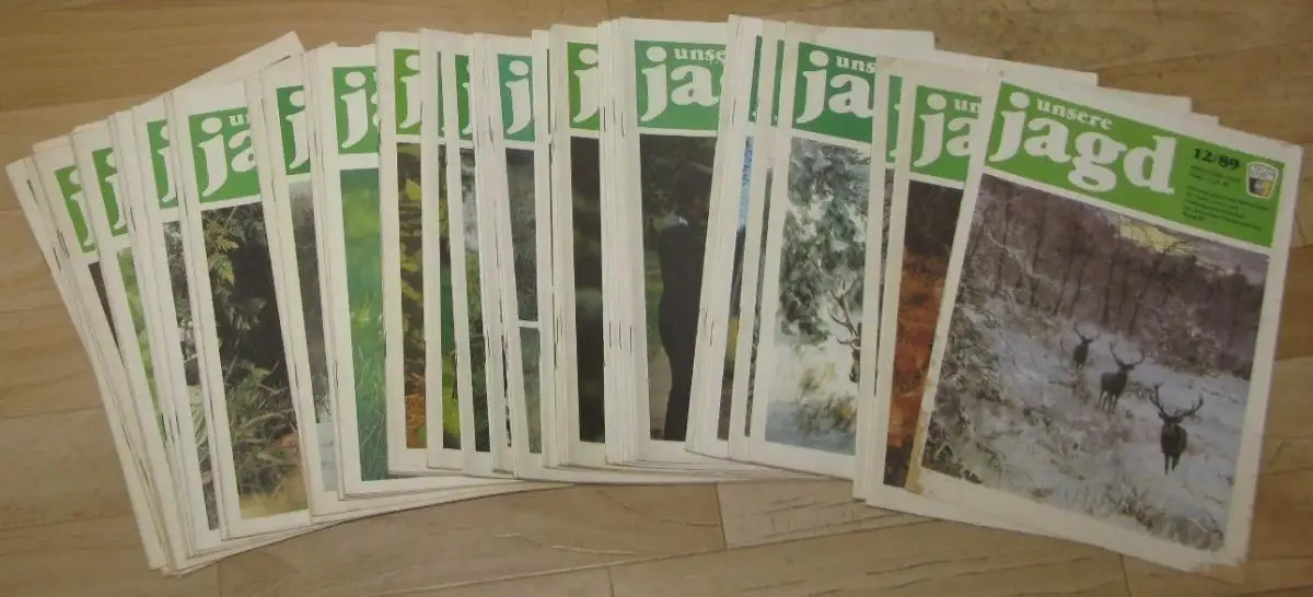 guter bis sehr guter Zustand, geringe Gebrauchs- und Alterungsspuren: einige Rückseiten mit Adressaufkleber, Sie erhalten die Hefte: - 1985: 1-4, 6-8, 10-12 - 1986: 1-12 (komplett) - 1987: 1-12 (komplett) - 1988: 1-12 (komplett) - 1989: 1, 11, 12 als Beispiel der Inhalt von Heft 11/89 - Initiativen zum 40. Jahrestag der DDR - Ofm. Dr. D. Konietzka, Fm. D. Kern: Rechnergestütztes Informationssystem im Jagdwesen - Fm. Dr.]. Goretzky, Fm. Dr. Christina Liess: Die Streckenentwicklung der jagdbaren Marderartigen (Mustelidae) in der DDR - G. Lieske: Ein Medaillenhirsch - Fm. Dagmar Röhler-Scheler: Markkleeberg — Anziehungspunkt für Hundeführer, Jagdkynologen und Jäger - Lfm. Dr. H.-J. Murswiek: Zur Jagdgesetzgebung und zum Inhalt der siebenten Durchführungsbestimmung zum Jagdgesetz sowie zur Qualifizierung auf dem Gebiet der Ordnung und Sicherheit im Jagdwesen - K. Weigel: Schwer geschlagen den Bassen gestellt - Dr. H.-D. Wilkomm: Widder — Schafe — Lämmer - Aus dem Leben der Jagdgesellschaften - Aus sozialistischen Bruderländern - Umschau international - Aus der Postmappe - Unterhaltsames für den Jäger - Rechtsecke - Anzeigen und Heft 1/85: - Ehrentafel - Ofm.-H.-D. Horstmann: Nationale Trophäenausstellung der VRB in Veliko Tarnowo - Ofm. H.-D. Horstmann: 7. Pokal der Freundschaft im jagdlichen Schießen der Jagdorganisationen sozialistischer Länder 1984 in der VR Bulgarien - J. Dietl: V. DDR-Bausiegerwettbewerb für Erdhunde aller Rassen - H. Marin: DDR-Leistungssiegerwettbewerb für Teckel - K. Geißler: X. DDR-Leistungssiegerprüfung der Rasse Deutsche Jagdterrier - M. Menzel: An der Fuchsröhre - ERSTE DURCHFÜHRUNGSBESTIMMUNG ZUR NATURSCHUTZBESTIMMUNG — SCHUTZ VON PFLANZEN UND TIERARTEN (ARTENSCHUTZBESTIMMUNG) - Dr. H. Deuter: Aus einem Nachsuchentagebuch - K.-D. Glietz: Nachsuchen — gewußt wann - Dr. H.-D. Willkomm: Entstehung und Entwicklung der Weidmannssprache (XVII) - Fasan und Rebhuhn - Aus dem Leben der Jagdgesellschaften - Aus sozialistischen Bruderländern - Aus dem Leben der Jagdgesellschaften - Humorvolles für den Jäger - Anzeigen - Rechtsecke für den Jäger - Anzeigen, Softcover, ca. 20 x 28, je 32 Seiten mit zahlreichen Bildern