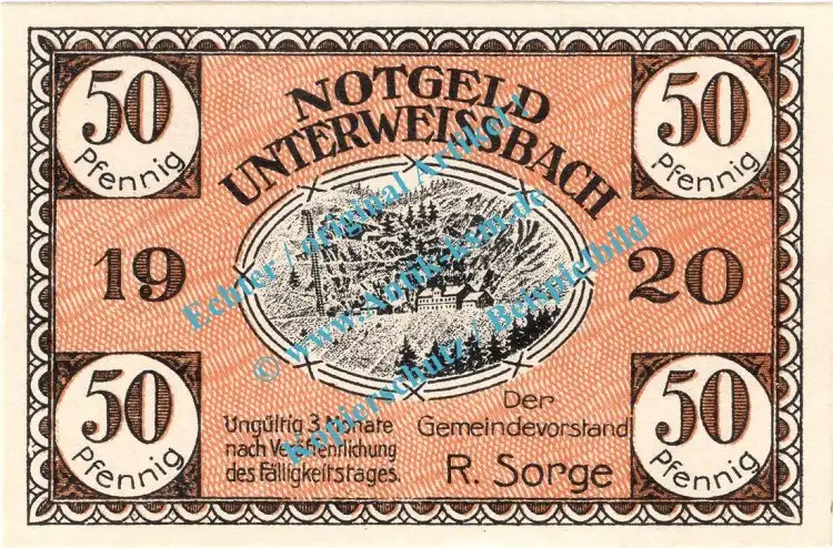 Unterweissbach , Notgeld 50 Pfennig Schein in kfr. Tieste 7550.05.03 , Thüringen 1920 Verkehrsausgabe