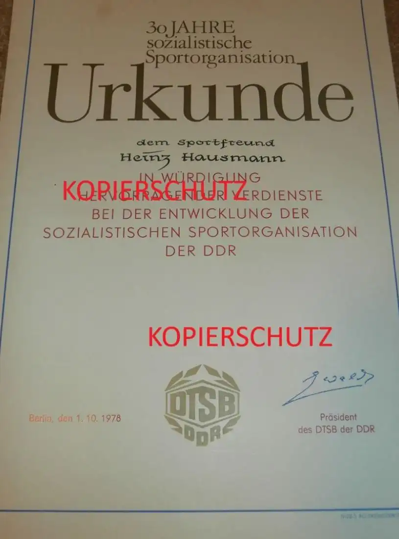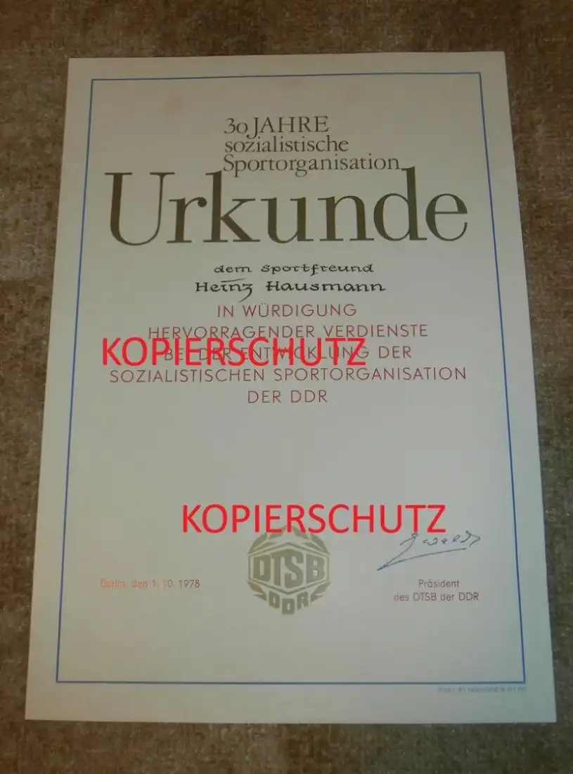 Urkunde - 30 Jahre DTSB der DDR , 1978 , Heinz Hausmann , Motorsport , Speedway !!!HeHa1