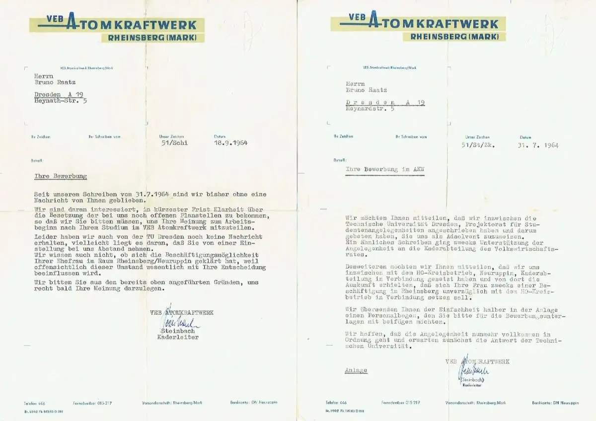 VEB Atomkraftwerk Rheinsberg: Konvolut Briefe zwecks Bewerbung u. a.