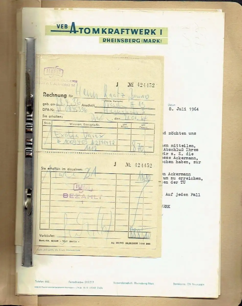 mittlerer bis noch guter Zustand, Gebrauchs- und Alterungsspuren: Ordner leicht verschmutzt und gering defekt - alle Schreiben mehr oder weniger knittrig und die meisten auch gefalten - alle bis auf 3 Schreiben des Atomkraftwerkes auch gelocht und eingeheftet - ein loses Schreiben des Kraftwerkes stärker beschädigt - Seiten aber überwiegend sauber und ordentlich, Sie erhalten, eingeheftet in einer Mappe, folgende Briefe / Schriftstücke: - 5 Briefe des Atomkraftwerkes wegen einer Bewerbung (3 in A4 und 2 in A5) - 1 Ilafot-Rechnung für den Erwerb einer Kamera Exakta Varex (1964) - 2 Rechnungen der Buchhandlung der TU Dresden und die Quittung, die die Bezahlung belegt - Qualitätsurkunde für das Trabant-Fahrgestell 01013 (Zwickau 1964) - 1 Arbeitsvertrag des Instituts für Datenverarbeitung Dresden und 2 Änderungsverträge dazu - Institut für Datenverarbeitung Dresden: Lohnerhöhungs-Schreiben - 4 Schreiben an und von der TU Dresden betreffs Wohnung / möbliertem Zimmer, Papier / kartoniert, 17 Seiten mit zahlreichen Bildern