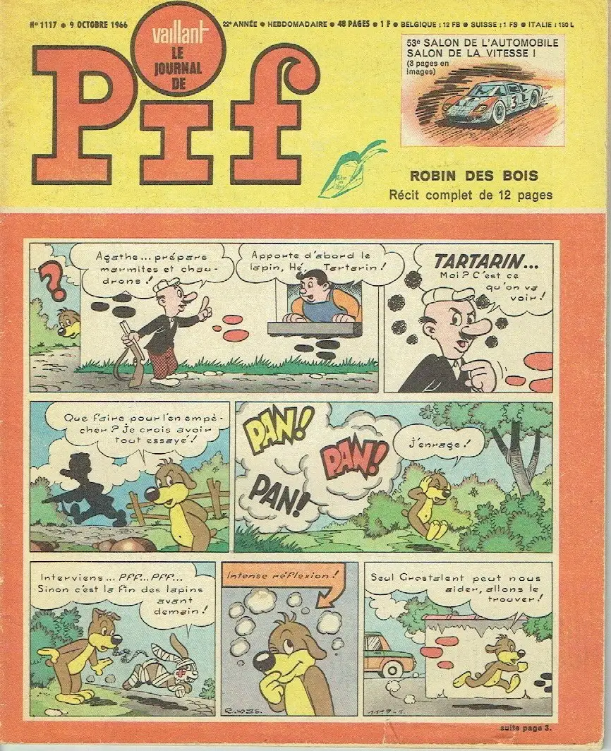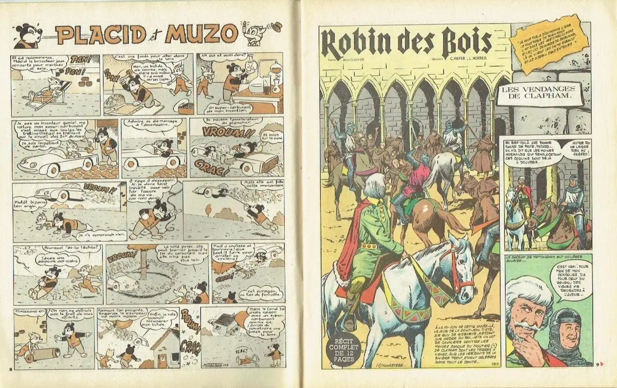 guter bis sehr guter Zustand, geringe Gebrauchs- und Alterungsspuren: Umschlag etwas beschabt, teils gering knittrig und abgegriffen - Vorderseite am unteren Rand gering defekt - vereinzelt kleines Eselsohr - selten kleiner Einriss, comic-Zeitschrift aus Frankreich avec "Robin des Bois" (Jean Olivier, C. Kiefer, L. Nortier), complet de 12 pages, Mas, Totoche dans: Les Sinistrés (Tabary), Placid et Muzo, Zor et Mlouf (Jean Sani & De Kamb), Arthur: Le Fantôme Justicier (Cézard), Ragnar le Fleuron de la Couronne, Les Jeudis de Corinne et Jeannot (Tabary), Le Salon de la Vitesse (Dominique Morigny), Jujube et Gai-Luron, Le Grêlé 7-13 (C. Gaty & L. Nortier & Roger Lécureux), Teddy Ted dans quand les Coyotes Hurleront (R. Lecureux & Gerald Forton), Le Pension Radicelle, Quentin Gentil contra Les Professionnels, Pifou Tête des Bois, Softcover, ca. 22 x 27, 48 Seiten mit zahlreichen Bildern