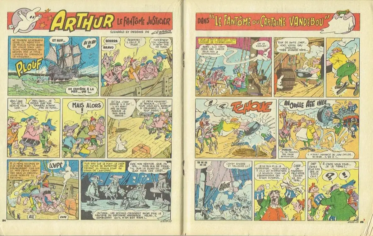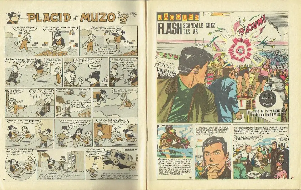 guter Zustand, geringe Gebrauchs- und Alterungsspuren: Umschlag etwas beschabt, teils gering knittrig und abgegriffen, am Rücken etils etwas aufgerissen - Umschlag und Seiten teils mehr oder weniger eselsohrig - gelegentlich kleiner Einriss - Rückseite gering beschädigt, comic-Zeitschrift aus Frankreich avec "Jacques Flash scandale chez les as" (Pierre Castex & René Deynis), complet de 12 pages avec Mas, Totoche dans: Les Sinistrés (Tabary), Placid et Muzo, Zor et Mlouf (Jean Sani & De Kamb), Arthur: Le Fantôme Justicier (Cézard), Ragnar le Fleuron de la Couronne, Les Jeudis de Corinne et Jeannot (Tabary), Jujube et Gai-Luron, Le Grêlé 7-13 (C. Gaty & L. Nortier & Roger Lécureux), Teddy Ted dans quand les Coyotes Hurleront (R. Lecureux & Gerald Forton), Le Pension Radicelle, Quentin Gentil contra Les Professionnels, Nestor fait du paysage, Pifou ... Virage Dangereux, Softcover, ca. 22 x 27, 48 Seiten mit zahlreichen Bildern