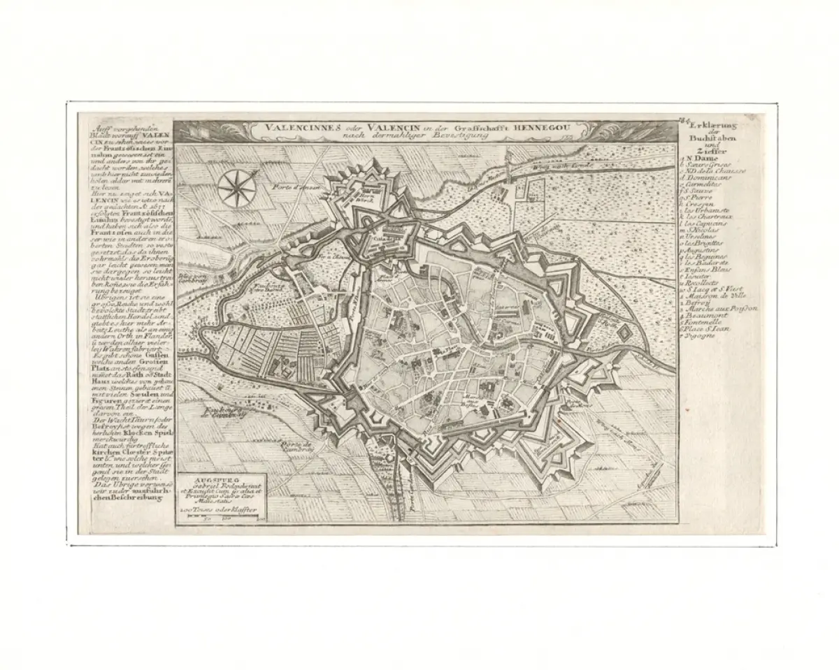 Valencinnes oder Valencin in der Graffschafft Hennegou nach dermahliger Bevestigung. Befestigungsplan aus der Vogelschau. Original-Kupferstich, Bodenehr, Gabriel