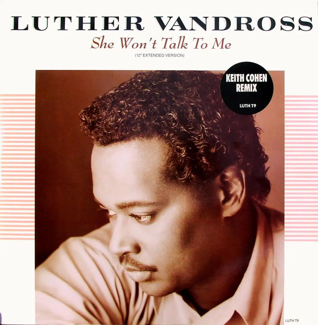 12" Maxi Luther Vandross - She Won't Talk To Me, Keith Cohen RMX, Ext. Vers.; Cover marqué, État plaque M- Holle VG+; Fabriqué en United Kingdom 1988 Epic LUTH T9, Tracks [12&wot. Ext Vers]., [House Dub], [Percapella]