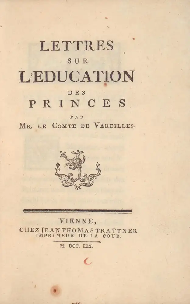 GV 150, S. 70. Vgl. Quérard, La France littéraire 10, S. 49 für die franz. Original-Ausgabe 1757. - Gutes, unbeschnittenes u. breitrandiges Exemplar mit nur vereinz. kl. Braunfl.. - 5 Briefe zur Prinzen-Erziehung des französischen Grafen Jean Marie de La Broue Vareilles (gestorben vor 1765) (Index Biogr. Francais 4, S. 1844)