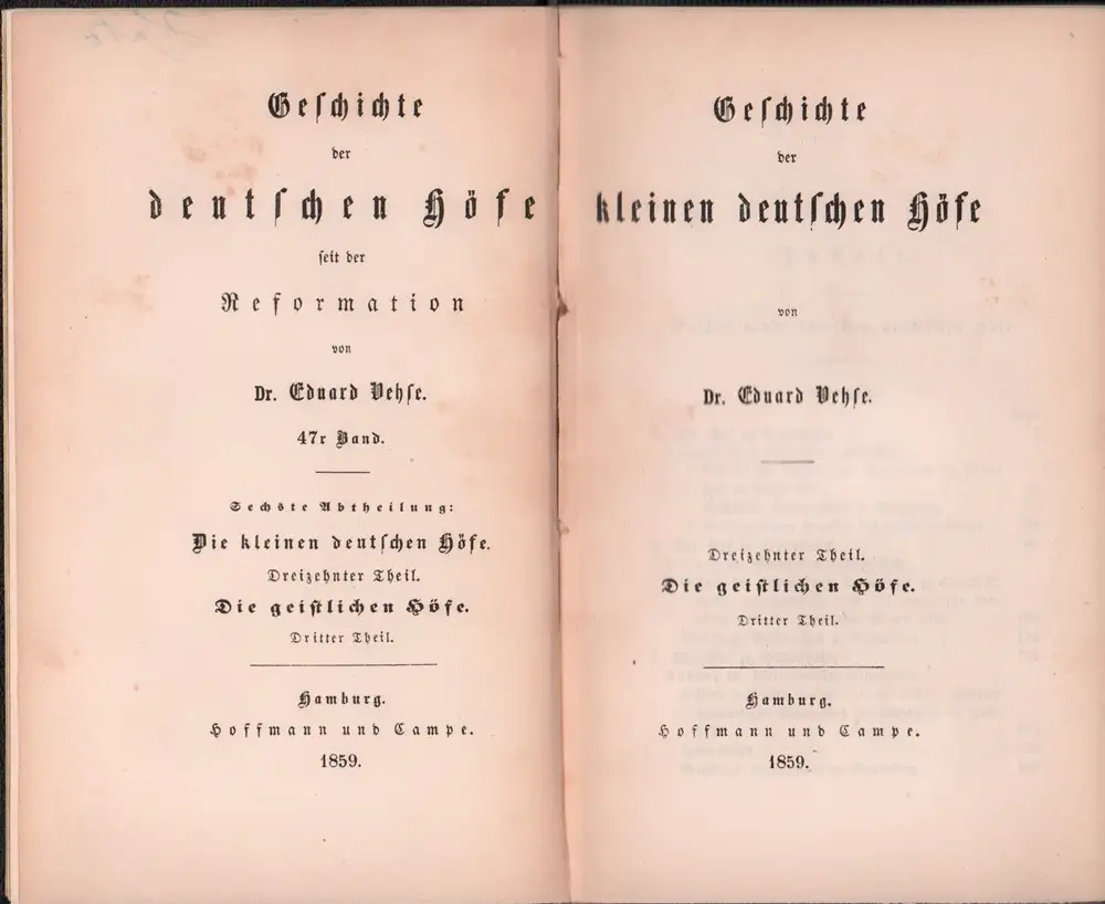 Vehse, Eduard: Geschichte der kleinen deutschen Höfe. Dreizehnter (bis vierzehnter) Theil: Die geistlichen Höfe, Theile 1-4 (= komplett) in 2 Bdn.