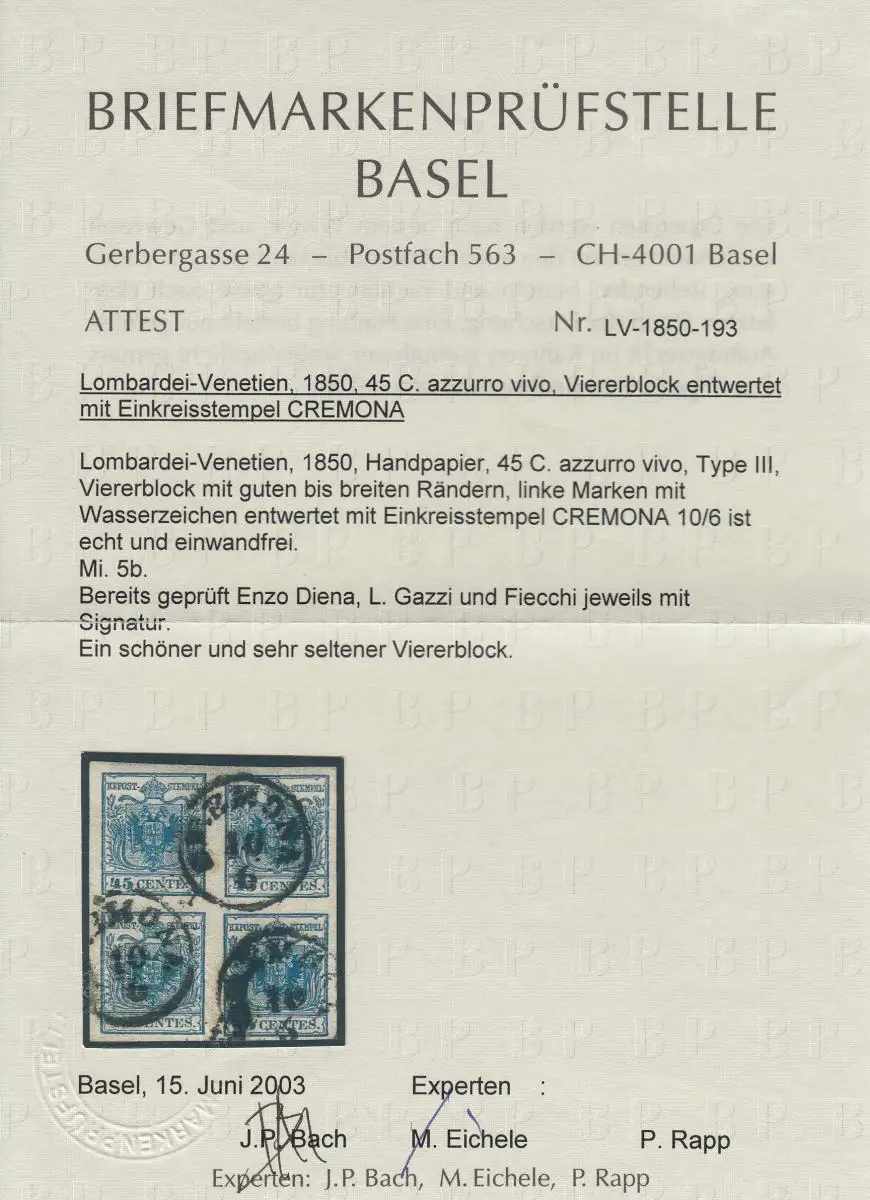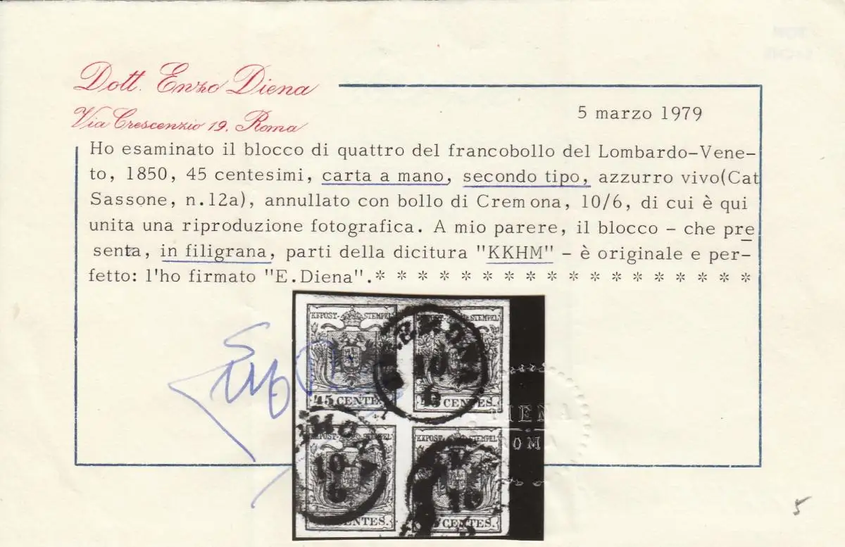 Vénétie-Lombardie 1850: Min. 5b, 4 blocs, cacheté Crémone