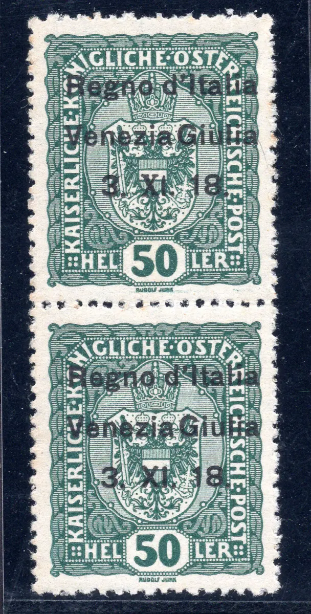 - MNH Vollgummi MNH - Venezia Giulia - Briefmarken Österreich 50 h. Nr. 11i vertikales Paar, ein Exemplar mit X-Aufdruckfehler anderer Schrift, neuer perfekter Vollgummi - signiert Enzo Diena Katalog Euro390 Cod.2166/WEB