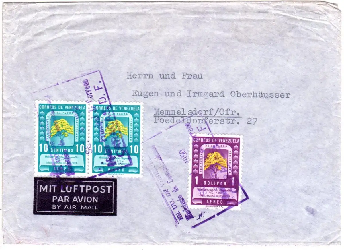 Venezuela 1950, 1 Bol.+2x10 C. Forstwoche auf Luftpost Brief n. Deutschland