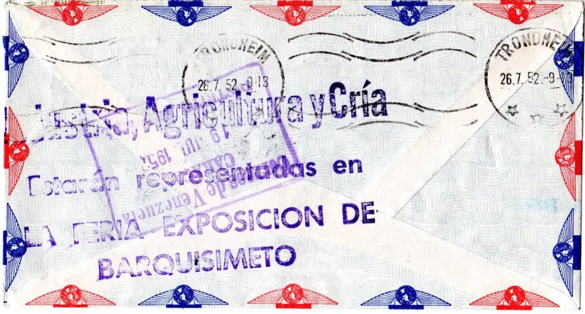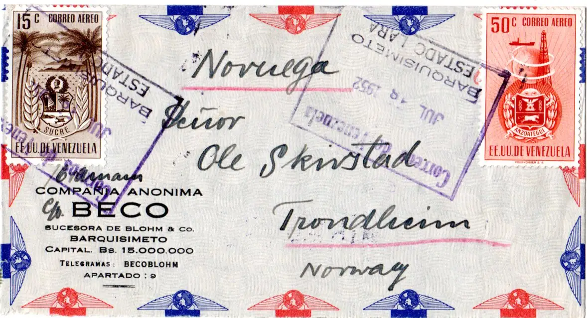 Venezuela 1952, 15+50 C. auf Luftpost Brief v. Barquisimeto n. Norwegen