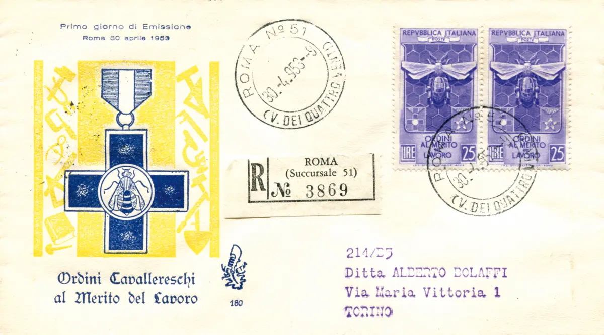 Umschlag - Verdienst der Arbeit Nr. 708 Paar auf Umschlag Racc. für Mailand mit Annullierung Cod. 437/14