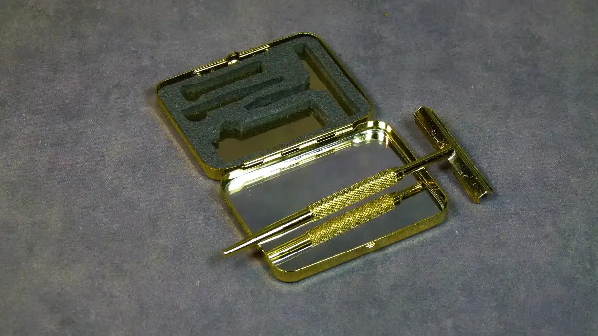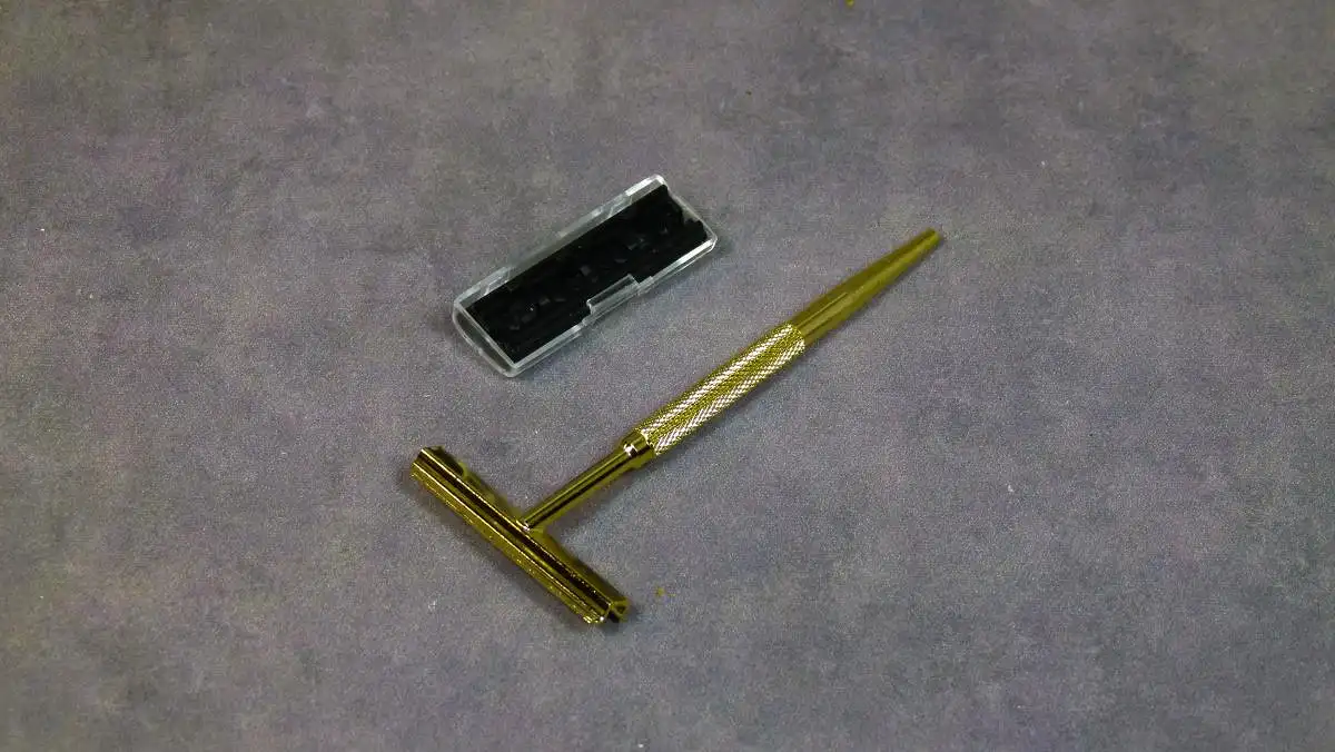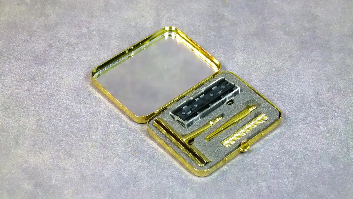 Eleganter vergoldeter Rasierer mit dreiteiligem Griff für Kunststoffklingen, unbenutzt mit zarten Mikrokratzern am Etui. Das vergoldete Etui verfügt über einen integrierten Spiegel für schnelle Korrekturen. Sehr guter Zustand. Ideal für Sammler von vintage Pflegeutensilien oder als stilvoller Akzent für zeitlose Eleganz.