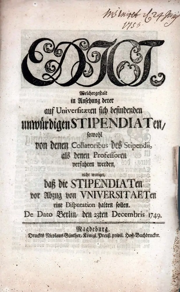 VD18 90196198. - "Edict, Welchergestalt in Ansehung derer auf Universitaeten sich befindenden unwürdigen Stipendiaten, sowohl von denen Collatoribus des Stipendii, als denen Professoren verfahren werden, nicht weniger, daß die Stipendiaten vor Abzug von Universitaeten eine Disputation halten sollen. De dato Berlin, den 23. Decembris 1749... Frederich." - Friedrich II. von Preußen, genannt der Große ("der Alte Fritz"), 1712-1786. - Notiz von alter Hand a. erster S. (datiert 24. Juni 1756). Etwas angerändert sowie (v.a. auf S. 1) mit Braunfleckpünktchen